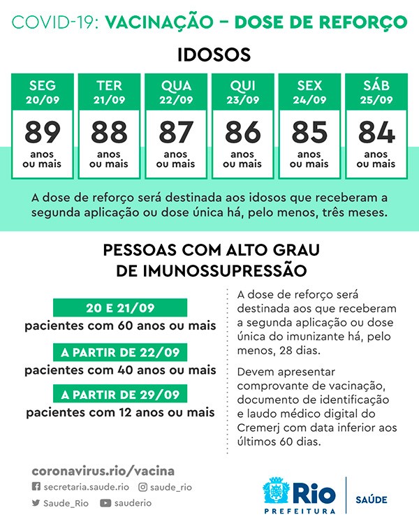 Prefeitura também aplica a dose de reforço em idosos com imunossupressão. A Prefeitura do Rio volta a aplicar a segunda dose da CoronaVac a partir desta segunda-feira (20). A segunda dose estava suspensa desde sexta (17) por falta de vacinas. O município também avança na dose de reforço em idosos em geral e imunossuprimidos. Nesta segunda, devem ir aos postos cariocas com 89 anos ou mais ou pacientes com imunossupressão acima de 60 anos. Não há previsão para vacinar meninos de 13 anos, os próximos na lista dos adolescentes. Calendário de vacinação no Rio de Janeiro Reprodução Vacinação de adolescentes Na sexta (17), a secretaria informou que manteria a vacinação de adolescentes de 14 anos marcada para esta sexta, mas que faria uma nova reunião com o comitê científico na quarta-feira (22) para avaliar como seguirá com a imunização a esse público. O questionamento foi feito depois que o Ministério da Saúde voltou atrás e passou a não recomendar vacinação de adolescentes sem comorbidades. A secretaria disse que o atendimento aos jovens de 13 e 12 anos "será submetido na próxima quarta-feira (22) ao Comitê Especial de Enfrentamento à Covid-19, que avaliará as ponderações do ministério". A pasta informou que até a data da reunião não haverá vacinação de adolescentes sem comorbidades no Rio. Vacinação de adolescentes deve ser retomada na próxima semana Celso Ávila/Prefeitura de Rio das Ostras Doses estão garantidas Apesar da reunião com o comitê científico, neste sábado (18), o secretário municipal de Saúde disse que a entrega de novas doses da Pfizer — a única vacina autorizada para ser aplicada em adolescentes — , deve acontecer na quarta-feira (22). "A entrega de mais vacinas da Pfizer já era esperada para a próxima quarta, e a gente espera retornar a vacinação dos adolescentes de 13 anos na quinta e na sexta-feira. Podendo antecipar a vacinação se o Ministério da Saúde antecipar a entrega", disse o secretário municipal de Saúde, Daniel Soranz. Governo do estado também quer a volta da vacinação Também na sexta-feira (17), o governo do estado do Rio de Janeiro manifestou-se a favor da continuação da vacinação contra a Covid em adolescentes. O documento da Secretaria de Estado de Saúde (SES) foi elaborado após reunião com o grupo de especialistas em Vigilância Epidemiológica, que assessora a vigilância estadual. Os pesquisadores manifestaram opinião a favor da imunização desse público levando em conta a eficácia e a segurança da vacina nessa faixa etária. A SES lembrou ainda no documento que desde o início da vacinação em adolescentes de 12 a 17 anos, no dia 24 de agosto, não houve nenhum registro de eventos adversos graves no estado.
